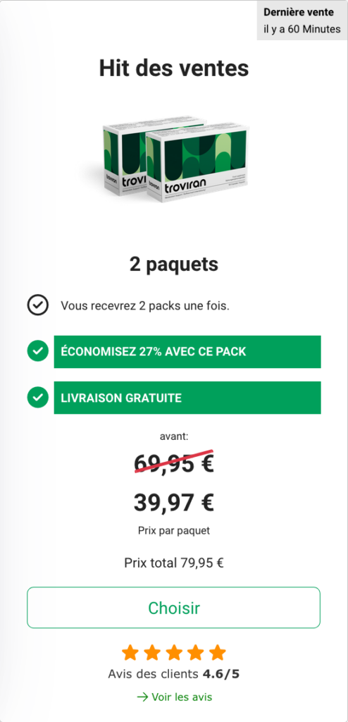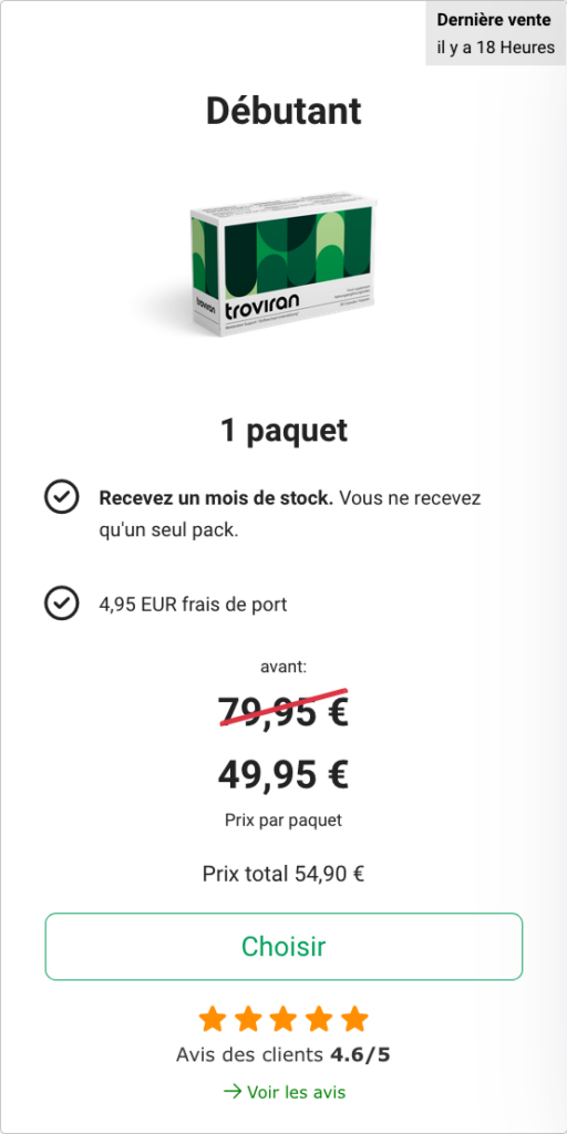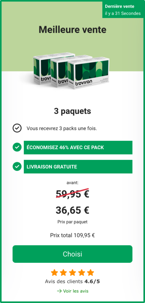Les utilisateurs qui ont dĂ©jĂ essayĂ© Troviran ont Ă©valuĂ© positivement le produit. Nous vous recommandons de baser votre dĂ©cision sur les avis clients et de vous faire une meilleure idĂ©e du produit. En ce qui concerne l’efficacitĂ©, vous constaterez que cela fonctionne un peu diffĂ©remment pour chacun.